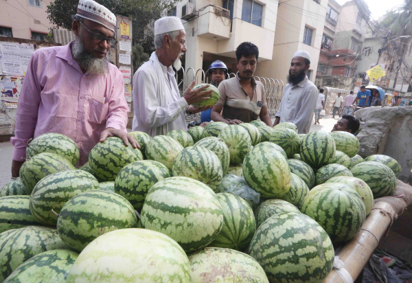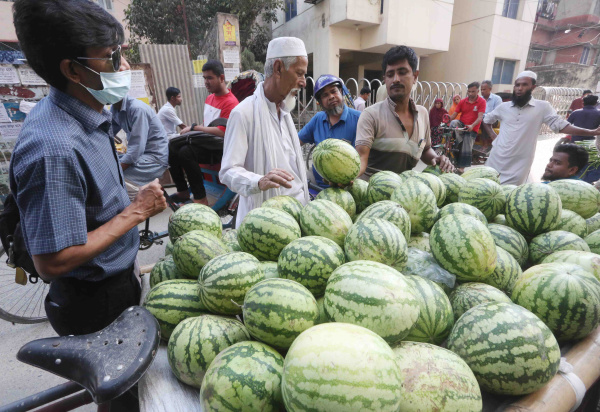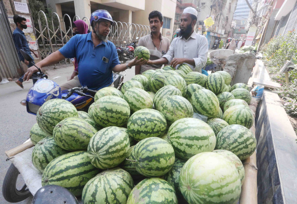 পাইকারি বাজারে পিস হিসেবে বিক্রি হচ্ছে তরমুজ। দেশের পাইকারি বাজার গুলোতে বেশ কিছুদিন ধরে যে দামে তরমুজ বিক্রি হচ্ছিল তা এখন অর্ধেকে নেমে এসেছে । খুচরা বাজারেও এর প্রভাব পড়তে শুরু করেছে। পাইকারি মূল্যে বর্তমানে প্রতিটি তরমুজ ১০০ থেকে ৩৫০ টাকায় বিক্রি হচ্ছে । খুচরা বাজারে যা বিক্রি করা হচ্ছে ১৫০-৫০০ টাকায়। ছবিটি শনিবার রাজধানীর শান্তিনগর এলাকা তোলা। ছবি – ইউএনএ