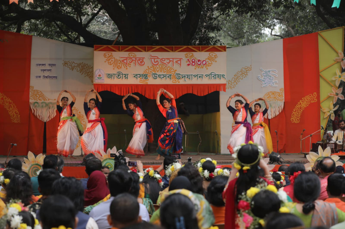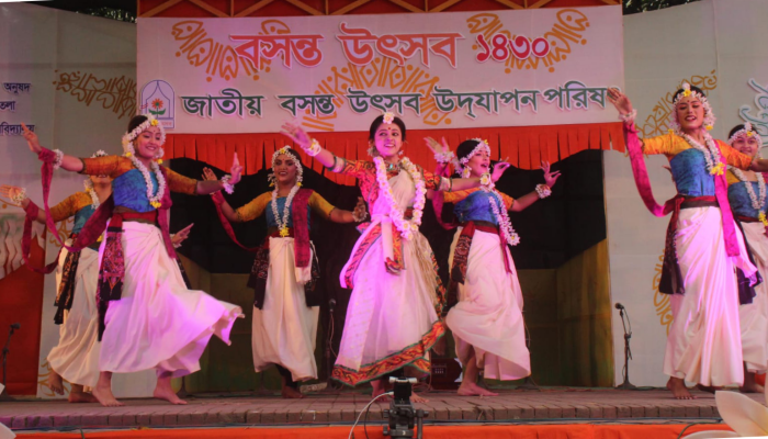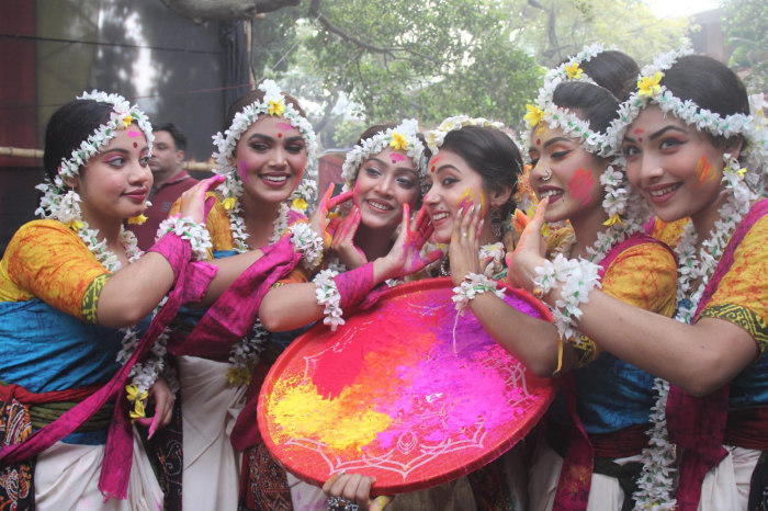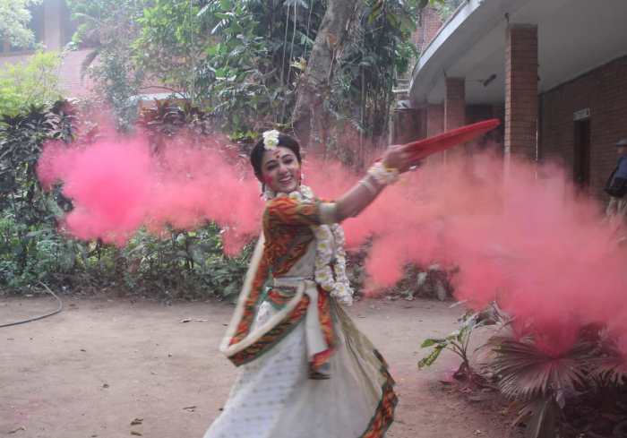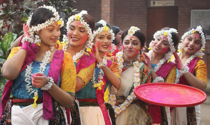 ঢাকা বিশ্ববিদ্যালয়ের চারুকলা অনুষদের বকুলতলায় পহেলা ফাল্গুন উপলক্ষে আয়োজন করা হয় বসন্ত উৎসবের। নাচ গানের মাধ্যমে বসন্তকে বরণ করে নেয় তরুণ তরুনিরা। ছবি –ইউএনএ
