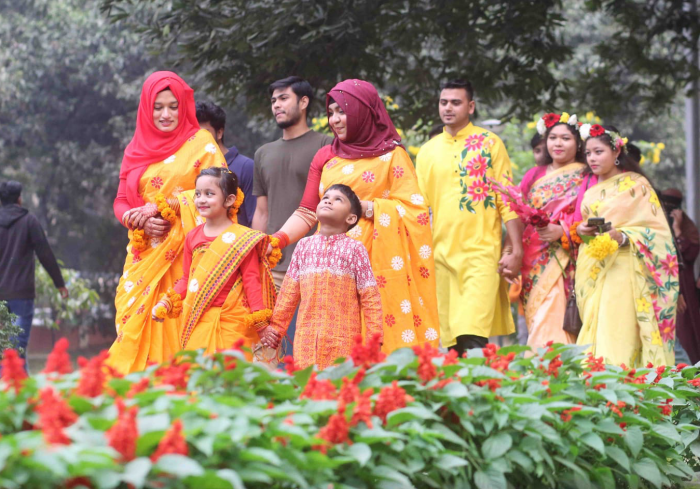 ফাল্গুনের প্রথম দিনে বসন্ত উৎসব ও ভালোবাসা দিবসে তরুণ তরুণীদের ও শিশুদের বর্ণিল সাজে দেখা মিলল রাজধানীর রমনাপার্কে।ছবি– ইউএনএ।